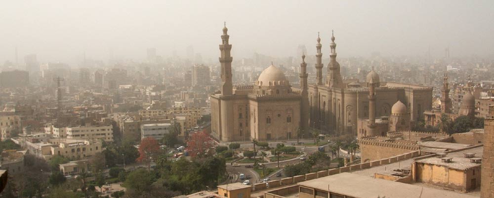 A panoramic view of Cairo from the Mohammad Ali Mosque. The haze is due to the sandstorm.