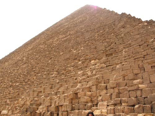 ![]() Just visible at the top of Khafre's pyramid are remnants of the polished white limestone finish that originally covered the whole of the pyramid. Many of the outer stones of the pyramids have been taken over the years to build Cairo. |