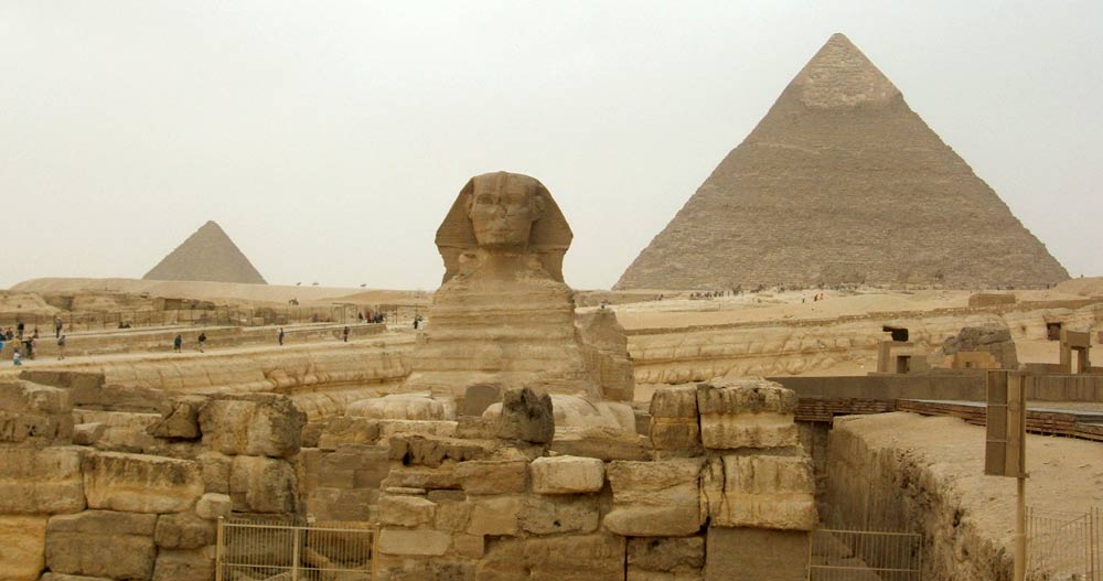 There are 3 main pyramids on the Giza plateau. The largest (hidden off to the right in this photo) was built by King Cheops, the next smallest on the right of this photo was built by his son Khafre and the smallest on the left built by his son Mekaure. There were a number of smaller ones at the base of the large ones for wives and family. The Sphinx in the foreground was sculpted by Khafre to embellish a large rock that stood in the way of the view of the pyramids. |