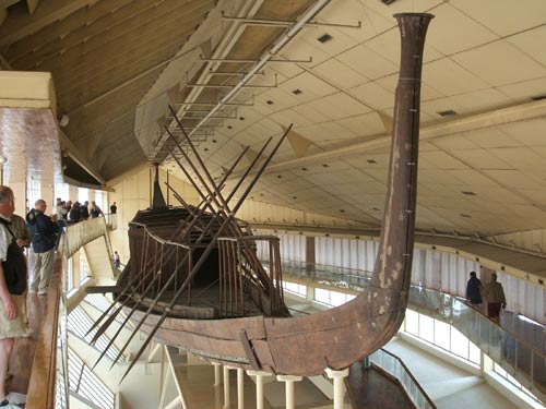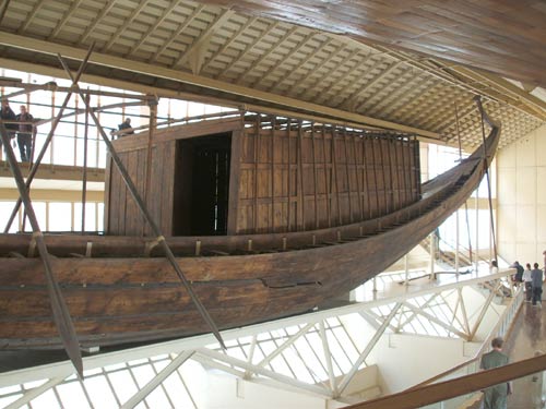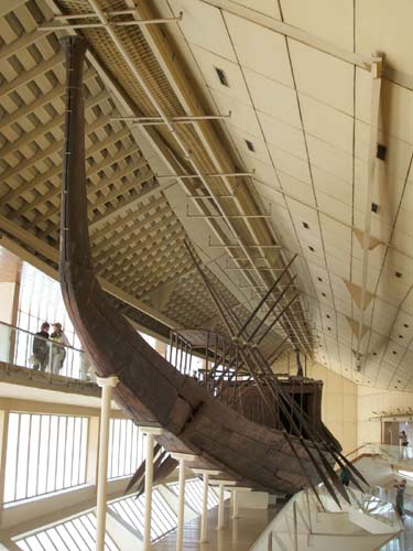 ![]() The Solar Boat is an amazing historical find. It is the boat used to bring King Cheops along the Nile to the pyramid after his death. It was found buried to one side of the base of his pyramid. |